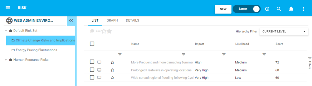 List view allows you to see all Risk items that you have access to, including the specific details within them. Viewing Risk items in a list allows users to have a quick view of various Risk items, facilitating navigation.