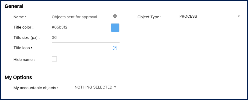 - Object Type: This is the primary filter when customizing this widget. It should be set first, as all subsequent items are derived from the selected object type. For example, if you wish to exclusively showcase performance objects, you can opt for “KCI, KPI, and KRI”. By default, only process objects are pre-selected when adding the widget to the home page.
