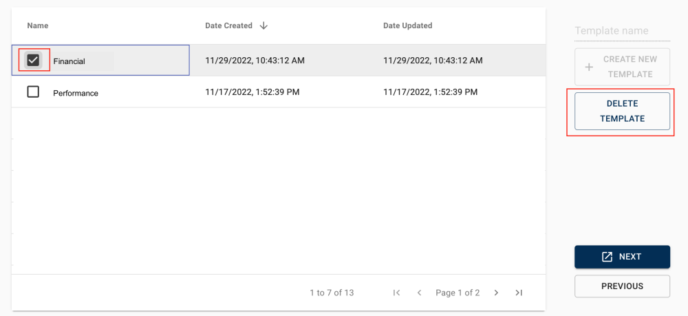 In this step, users can find any template that is saved in the environment. Users can also delete a template if needed by clicking on the desired template then “Delete Template”.