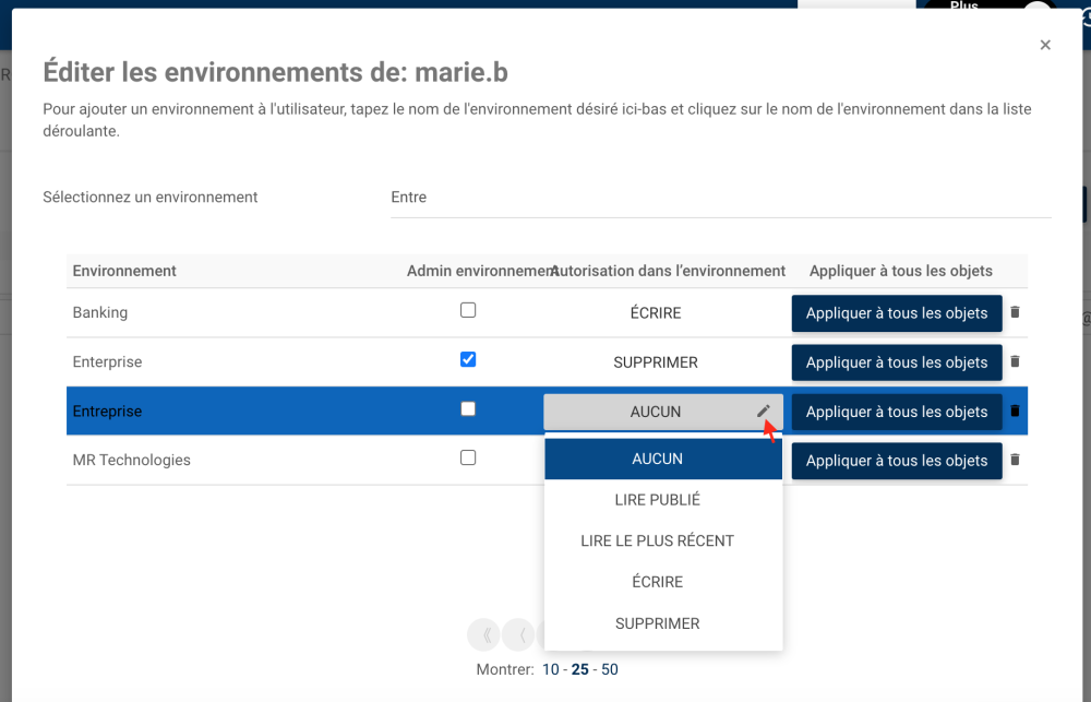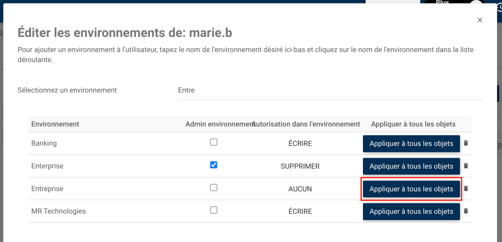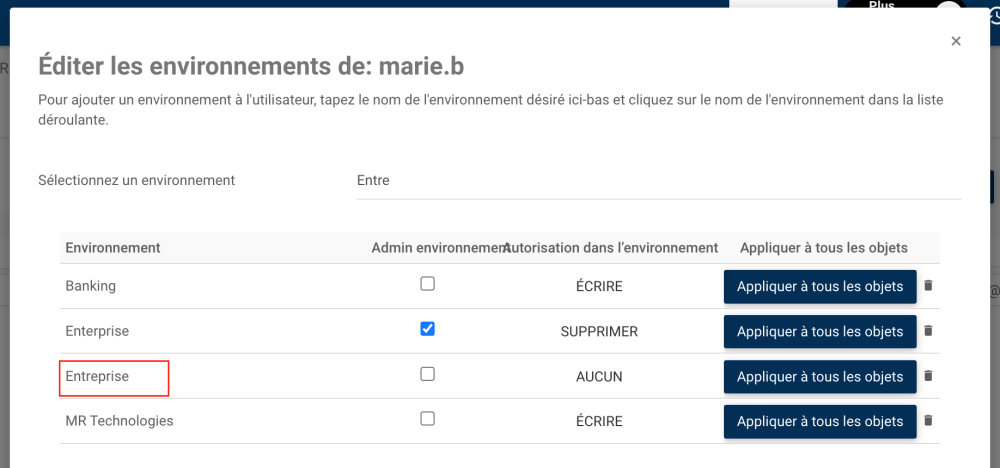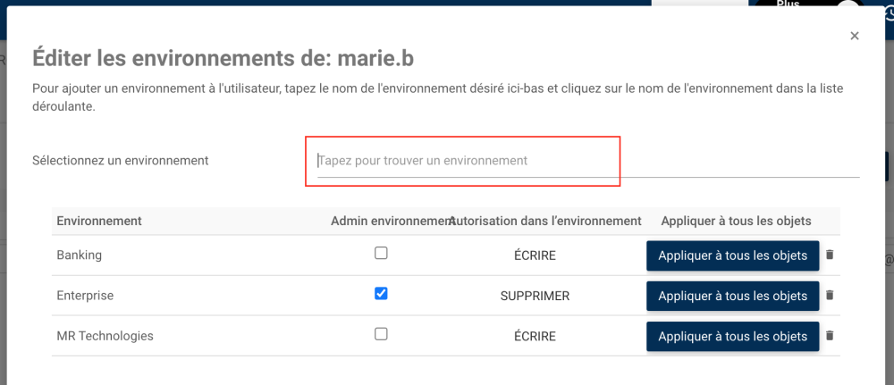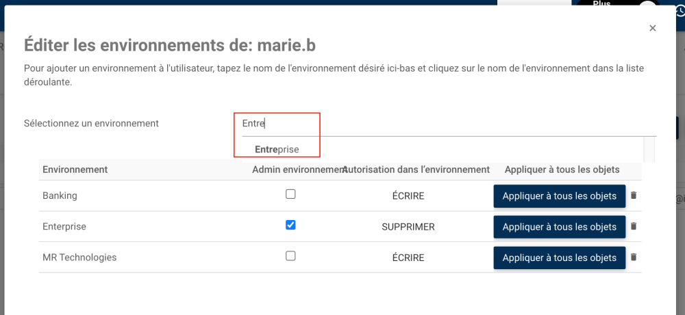 3. Saisissez le nom de l’environnement que vous souhaitez ajouter à l’utilisateur. Cliquez sur l’environnement pour finir de l’ajouter