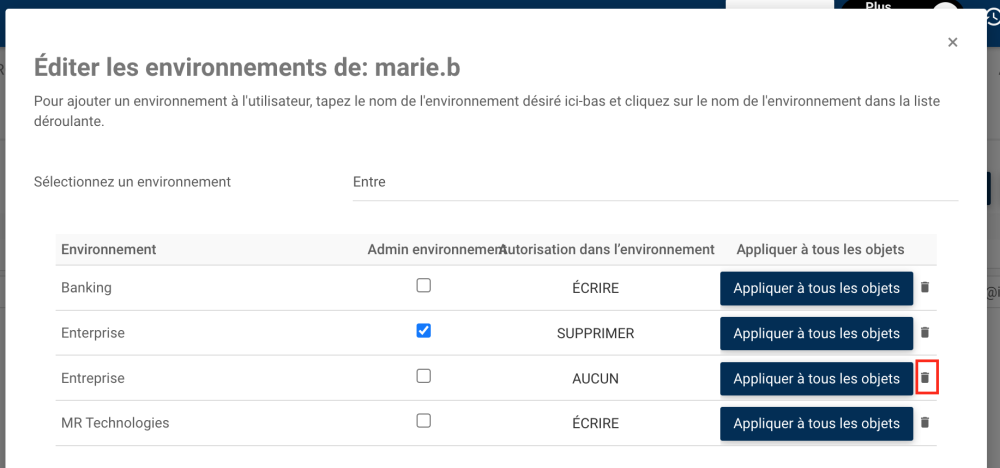 7. Pour supprimer un groupe d’un environnement, cliquez sur l’icône de la corbeille à côté de la case “Appliquer à tous les objets”.