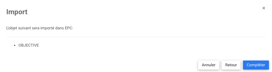 - Ecraser le contenu: Si cette option est sélectionnée, les objets importés et les objets écrasés devront avoir un identifiant défini. Les objets importés remplaceront les objets existants dans l’EPC si un identificateur correspond. Reportez-vous à la section écrasement dans l’importation Excel pour plus d’informations.