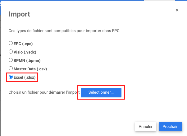2. Dans la fenêtre d’importation, sélectionnez Excel (.xlsx) et téléchargez le fichier Excel.