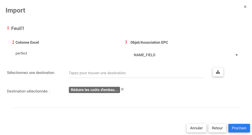 - Destination: Vous pouvez sélectionner une destination pour importer votre feuille Excel. Si vous ne sélectionnez pas de destination, un ensemble sera automatiquement créé.