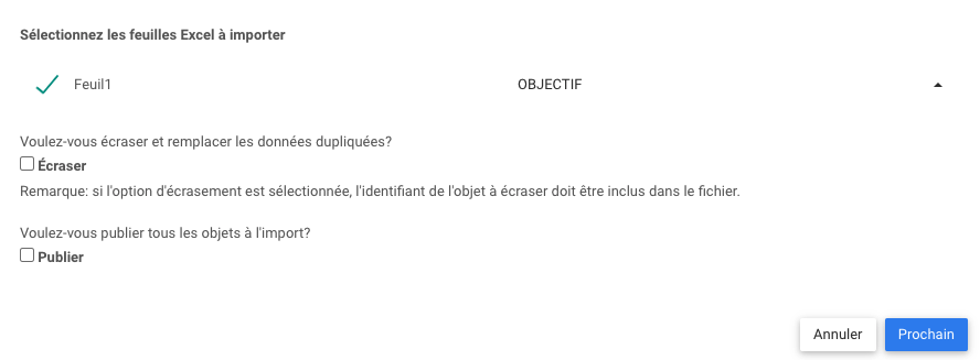 3. Une fois que vous avez téléchargé votre fichier, vous serez invité à sélectionner les feuilles du fichier Excel que vous souhaitez importer. Après avoir sélectionné une feuille, attribuez un objet racine dans la liste déroulante adjacente. Indiquez si vous souhaitez écraser le contenu et le publier lors de l’importation. Cliquez sur Suivant.
