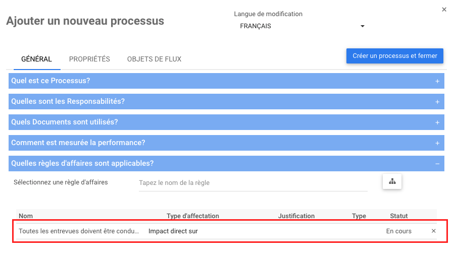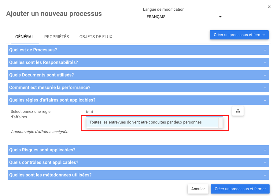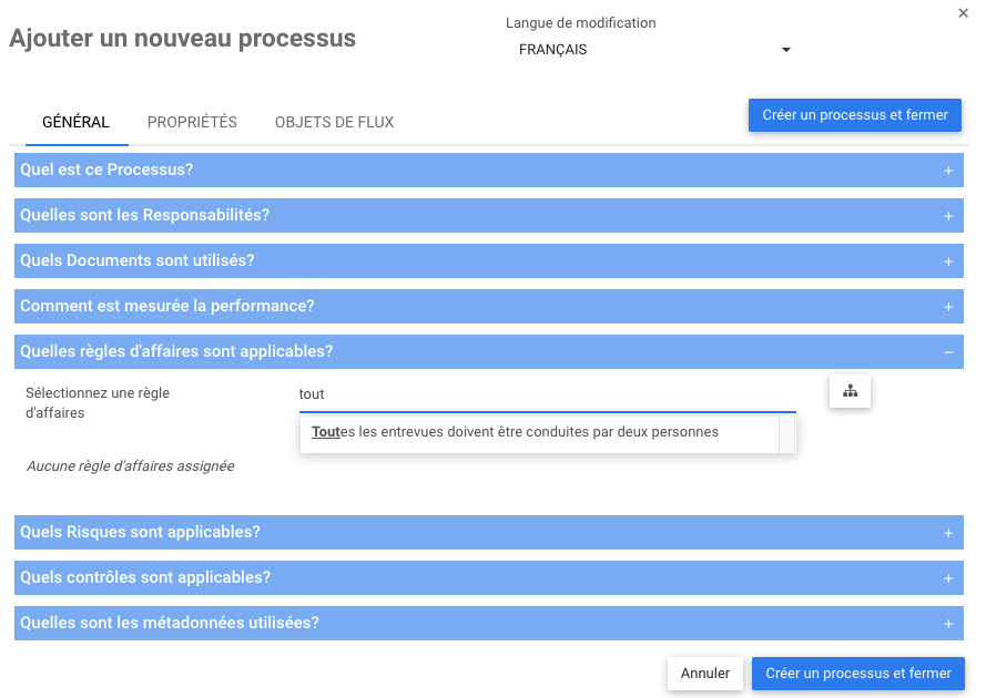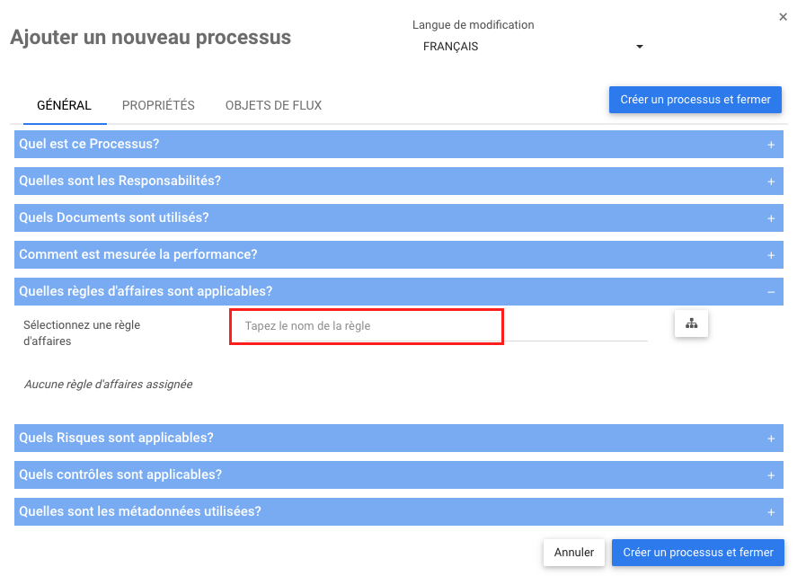 Cette section est disponible dans le formulaire d’édition des processus, des objets de flux, des actifs et des règles d’affaire (en tant que sous-règles).