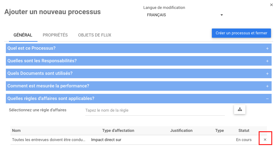 Pour supprimer la règle d’affaire de l’objet, cliquez sur le bouton