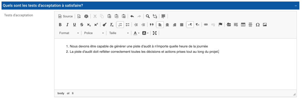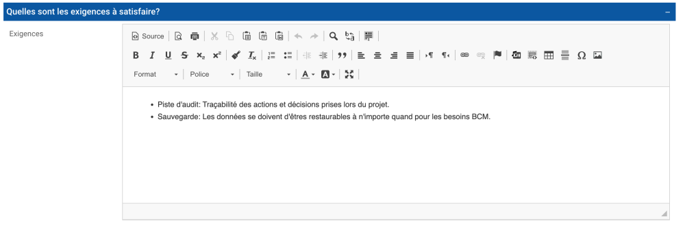 3. Tapez les exigences souhaitées dans la zone de texte riche.