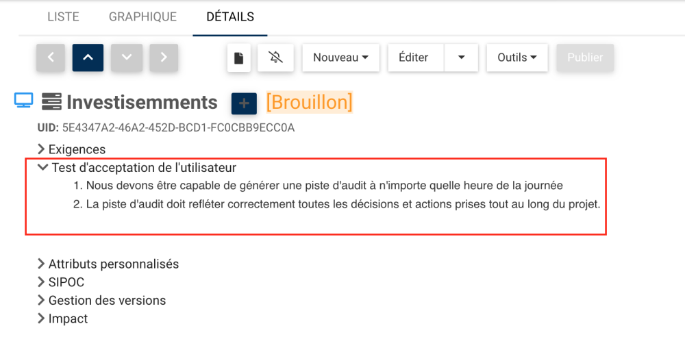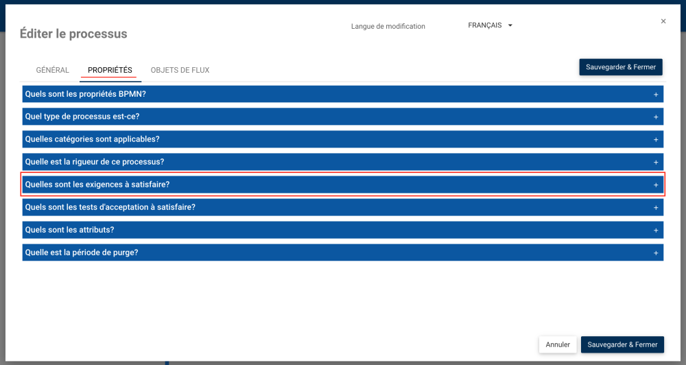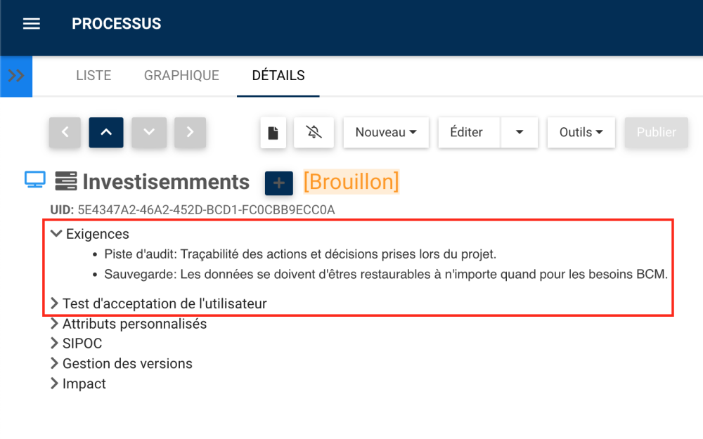 Les exigences d’objets servent de liste de fonctions et de règles auxquelles l’objet doit se conformer pour s’assurer que l’exigence d’affaire est satisfaite. Les Test d’acceptation par l’utilisateur (UAT) d’objets servent de liste de contrôle des tests qui doivent être réussis pour garantir le bon fonctionnement des exigences d’affaires. Ces sections ne sont disponibles que dans le module Processus.