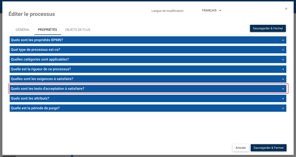 1. Accédez à l’onglet Propriétés de la page “Détails” d’un processus et cliquez sur Quelles sont les tests d’acceptation à satisfaire ?