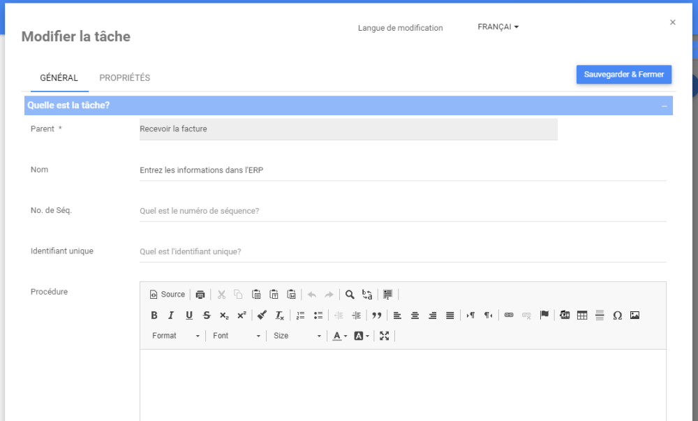 | Procédure | Ce champ décrit les procédures et les étapes de l’objet de flux. Le format RTF permet la mise en forme du texte, des images, des URL, des tableaux, etc. |