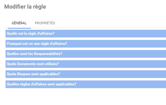 | Quel est un exemple de cette règle? | Champ pour saisir un exemple de la règle |