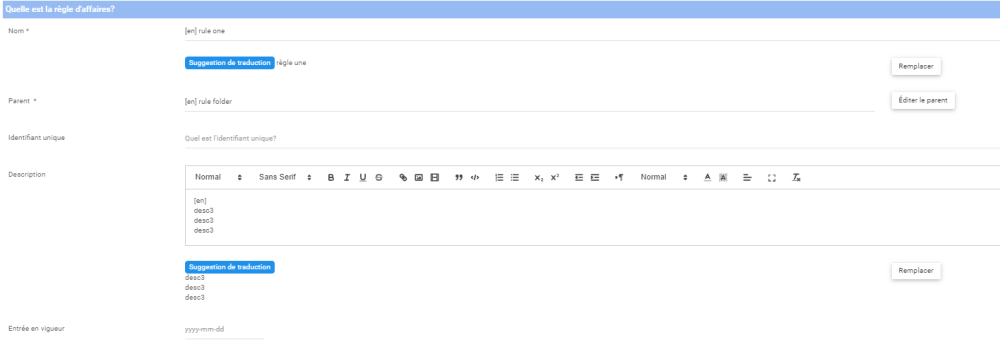 | Description | Ce champ décrit la règle en détail. Le format de texte enrichi permet la mise en forme de texte, les images, les URL, les tableaux, etc. |