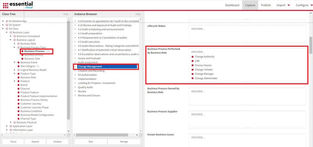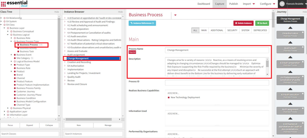 Si les utilisateurs créent un processus dans EPC et établissent les relations avec ce processus (par exemple, unité organisationnelle, ressource, actif, rôle), ces objets seront créés automatiquement dans Essential Projects. De plus, les objets créés dans Essential Projects seront également créés dans l’EPC. C’est ainsi que les deux systèmes peuvent communiquer et garantir la synchronisation.