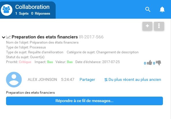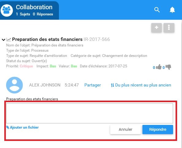 Les utilisateurs peuvent répondre aux engagements de collaboration dans la fenêtre de collaboration. Les utilisateurs sont invités à partager leurs opinions et leurs points de vue afin de promouvoir davantage l’amélioration continue au sein d’une organisation.