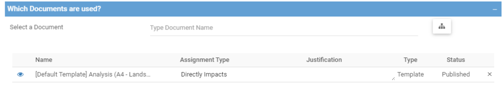 Once your users is in the edit details form of a business object, they can choose to associate different EPC to one another. Once they’ve selected an object, a table will display the name, the assignment type, the justification and the remaining fields. The cell corresponding to the assignment type and the associated object will display Directly Impacts by default. Afterwards your users can select a broad range of default system values or use the custom assignment types to categorize them.