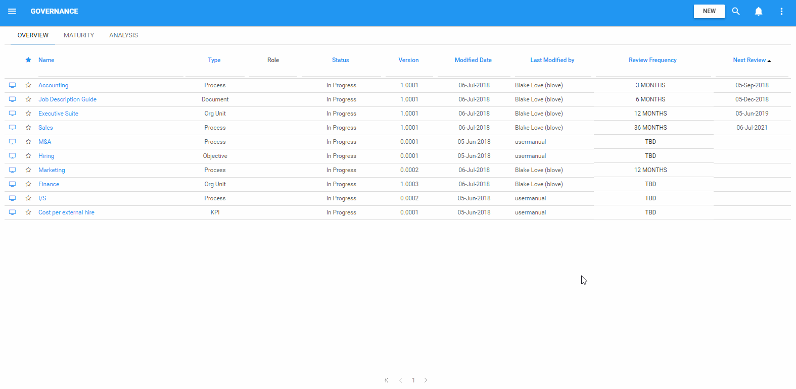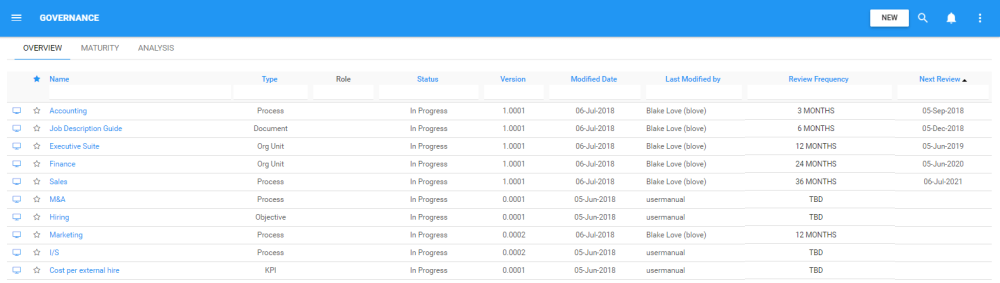 Die Registerkarte Übersicht der Governance listet alle EPC-Objekte auf und ermöglicht die Bearbeitung und Analyse ihrer Häufigkeit. Überprüfungszyklen dienen einem wichtigen Bedürfnis von Unternehmen, die Compliance-Anforderungen erfüllen wollen, und dank der automatisierten Generierung von Überprüfungsdaten durch EPC werden Objekteigentümer benachrichtigt, wenn eine Objektüberprüfung bevorsteht und überfällig ist.