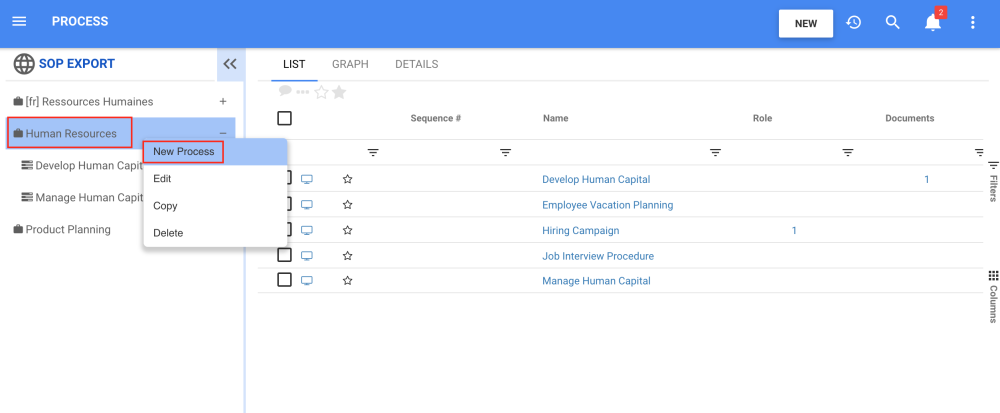 3. Right-click and select one of the displayed menu options that will appear on the right side. For example, we can create a “New Process”.