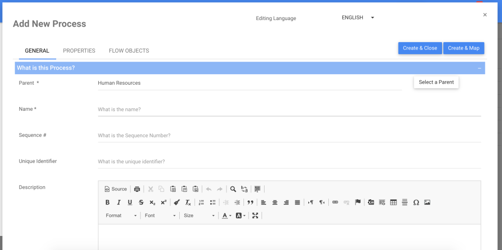 6. Add the information about the New process and click on the Create & Close button.