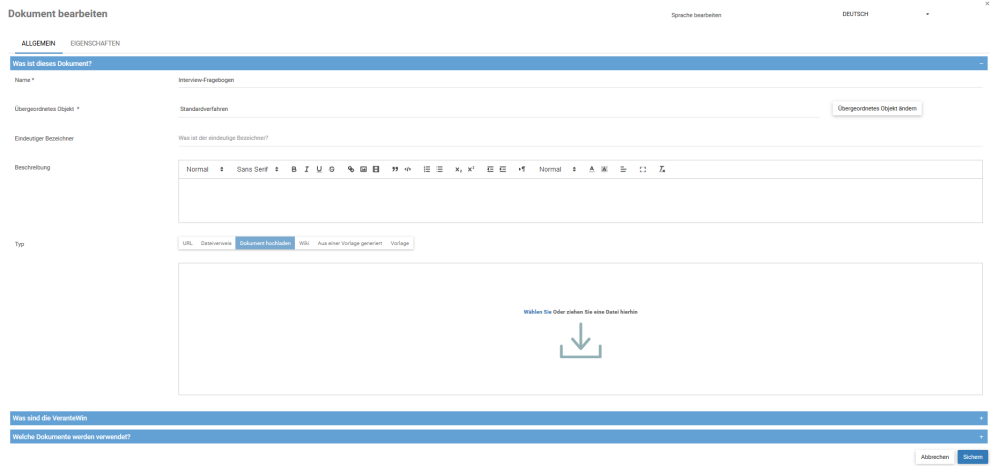 | Beschreibung | Dieses Feld beschreibt das Dokument im Detail. Das Rich-Text-Format ermöglicht Textformatierungen, Bilder, URLs, Tabellen, etc. |