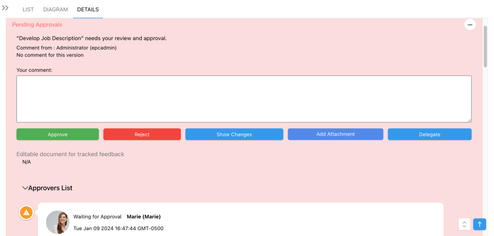 Let’s now approve or reject the approval cycle made on the “Develop Job Description.”