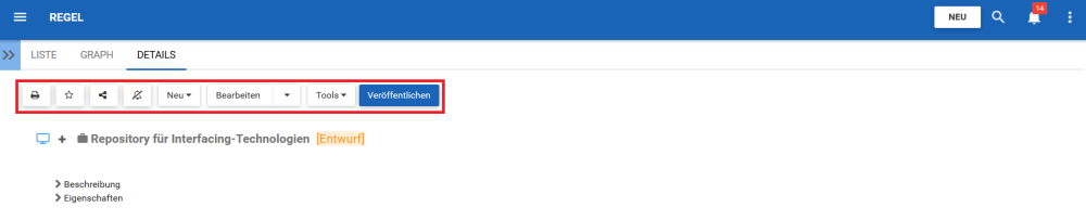 Die Symbolleiste bietet dem Benutzer eine Vielzahl von Funktionen zur Navigation und Nutzung der Detailseite.