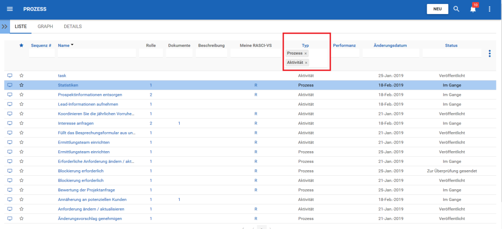Beispiel: Sowohl Prozess als auch Aufgabe sind im Filter enthalten.