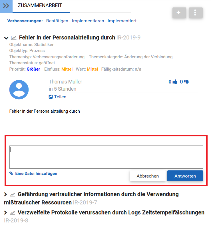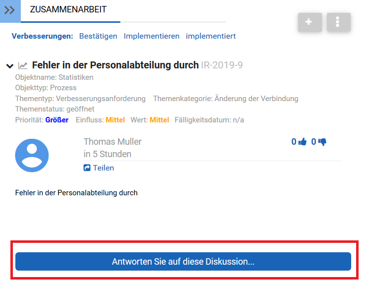 Benutzer können auf Collaboration-Verpflichtungen innerhalb des Collaboration-Fensters antworten. Die Benutzer werden ermutigt, ihre Meinungen und Perspektiven auszutauschen, um die kontinuierliche Verbesserung innerhalb eines Unternehmens weiter zu fördern.