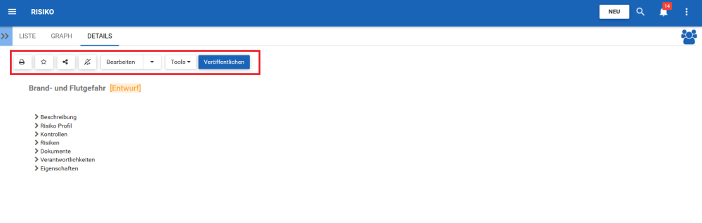 Die Symbolleiste bietet dem Benutzer eine Vielzahl von Funktionen zur Navigation und Nutzung der Detailseite.