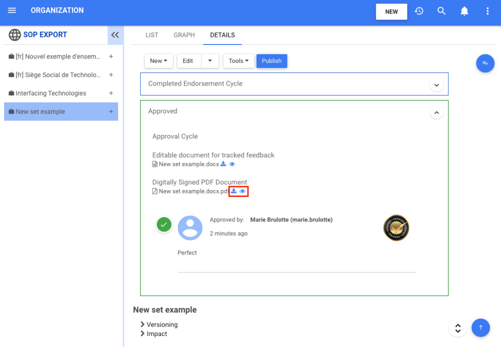 | Given an object is in published status after it was approved and signature was enabled, when a modeler decide to browse to a previous version of a an object, they can download the document before they revert to the object. |