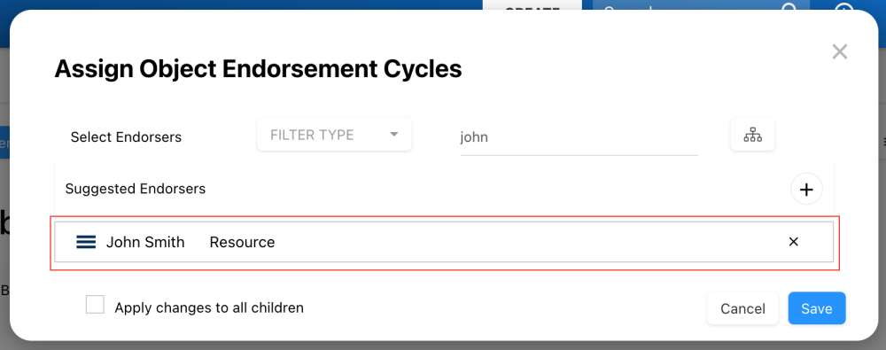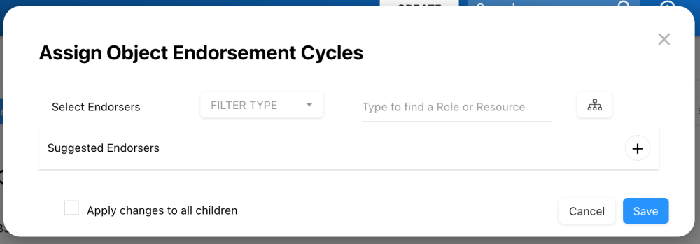 - Apply changes to all children: If checked, the current endorsement cycle configuration will be applied to this object’s children (sub-objects).