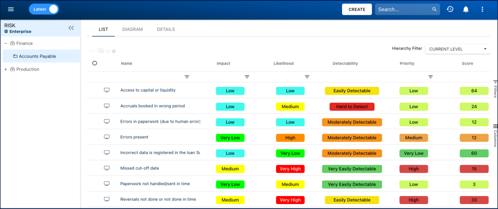 In the List view of the Risk module, we’ve introduced a color-coded system to signify the impact, likelihood, score, detectability, and priority levels based on the predefined risk matrix. This implementation serves two key purposes: