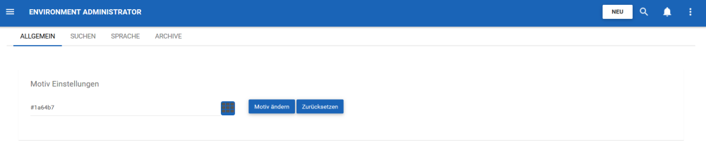 Umgebungsadministratoren verfügen über einen Umgebungsadministrationsabschnitt, in dem sie Umgebungseinstellungen bearbeiten können. Umgebungs- und Systemadministratoren haben Zugriff auf diesen Abschnitt in der EPC Web App. Von diesem Abschnitt aus haben Umweltadministratoren Zugriff auf die Einstellungen Allgemein, Suche und Sprache.