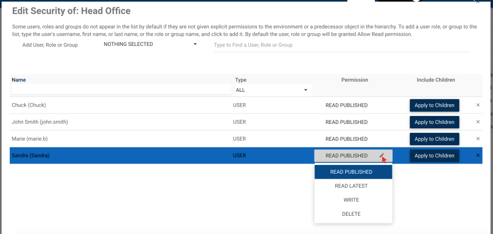 Edit the security and click Done when ready. Optionally, click the Apply to Children box to propagate the new permission to its sub-objects.