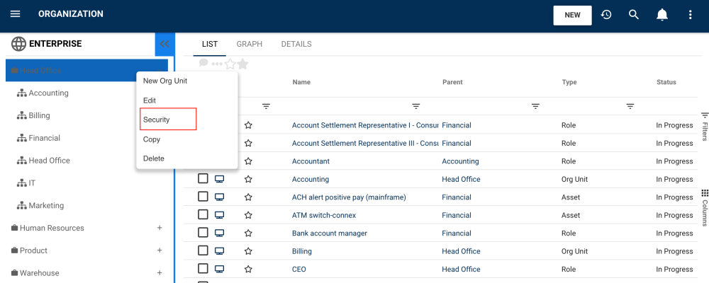 To access this feature, navigate to the desired module, right-click on an object and select “Security”.