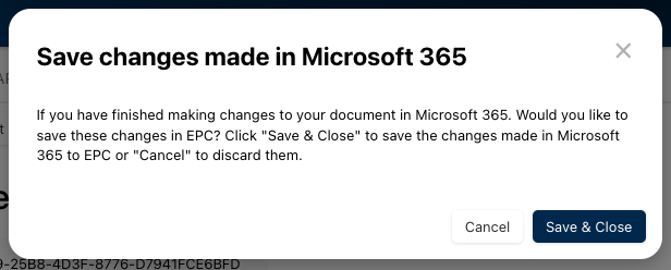 - Clicking ‘Save and Close’ will automatically save the user’s changes back to EPC, where they can view the updated document. Alternatively, to discard their changes, users can click on the ‘Cancel’ button.