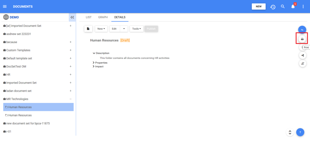 The print button allows Web- Modelers to directly print the details page that they are currently viewing. Selecting the print function will automatically generate a formatted details page printout that a user can print directly.