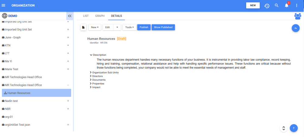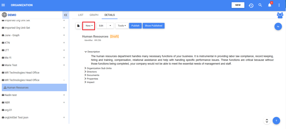 1. A drop-down will be generated where you can choose the new item you want to create. In this example, the drop-down will show all the objects that can be created within an Organization Unit.