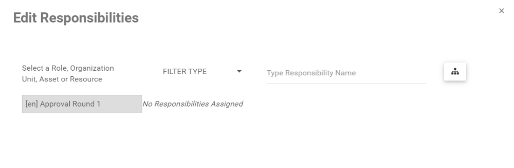 A RASCI matrix will appear and the user will be capable of adding resources, roles, organization units and assets to assign or edit responsibilities. It is important to note that sets and folders will be ignored if selected as they cannot be assigned RASCI. Additionally, objects which are locked, in review, do not have write permission or are in an approval cycle will also be ignored.