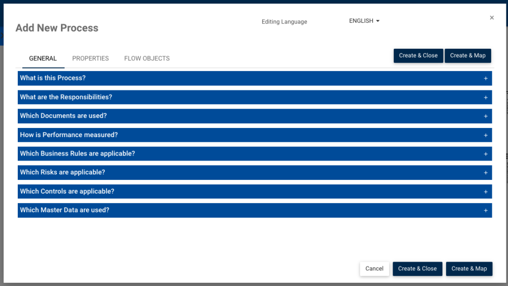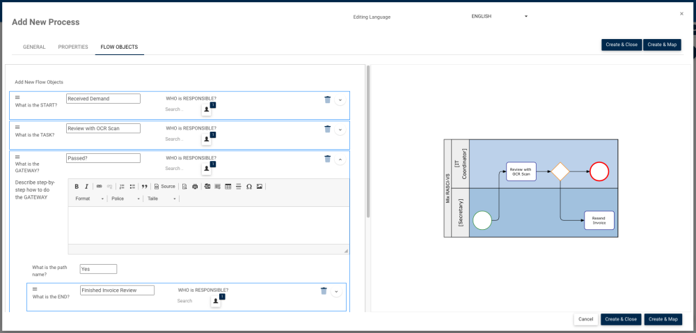 c) Click on the Flow Objects tab, where you can add flow objects, name them, write a description and assign the responsible role. A Swimlanes Map preview will be generated as you add flow objects, to give you a glance of what the process map will look like once created: