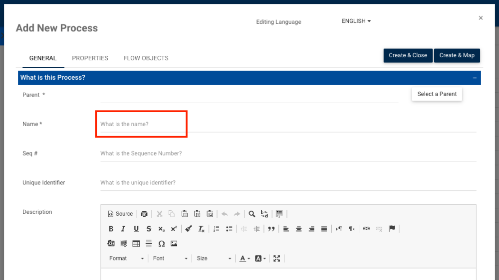 4. Type the name of the Process on the “What is the name?” field and select a parent Process. Without a name and a parent process, the process can’t be created.