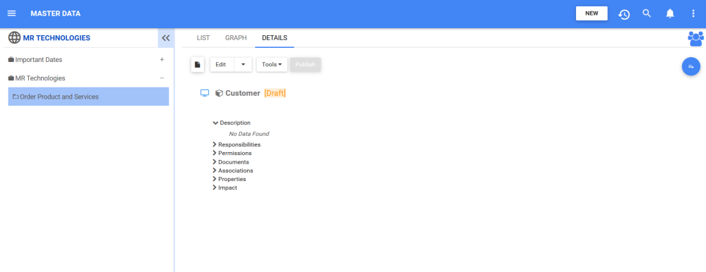 - The new Attribute “Customer” is now inside of the “Order Product and Services” folder. This Attribute is currently a draft. To learn how to publish Master Data objects, click here
