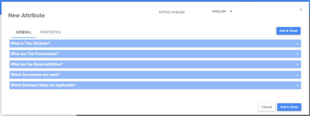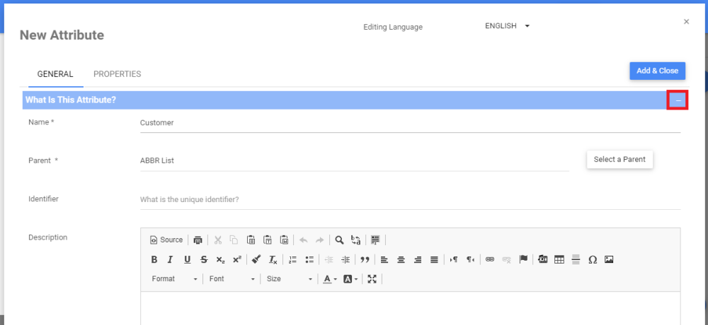 icons to expand and hide the different sections within each tab of the New Attribute Window. Input the right information about the Attribute in each section.