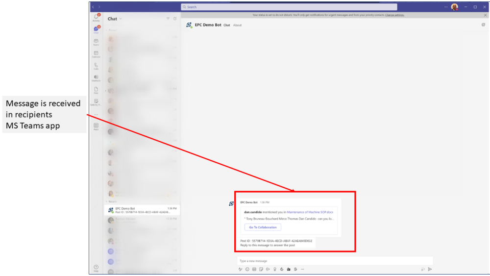 - Reply to EPC collaboration messages directly in the Teams application, which will be posted in the collaboration topic, ensuring that all conversations remain synchronized and easily accessible.
