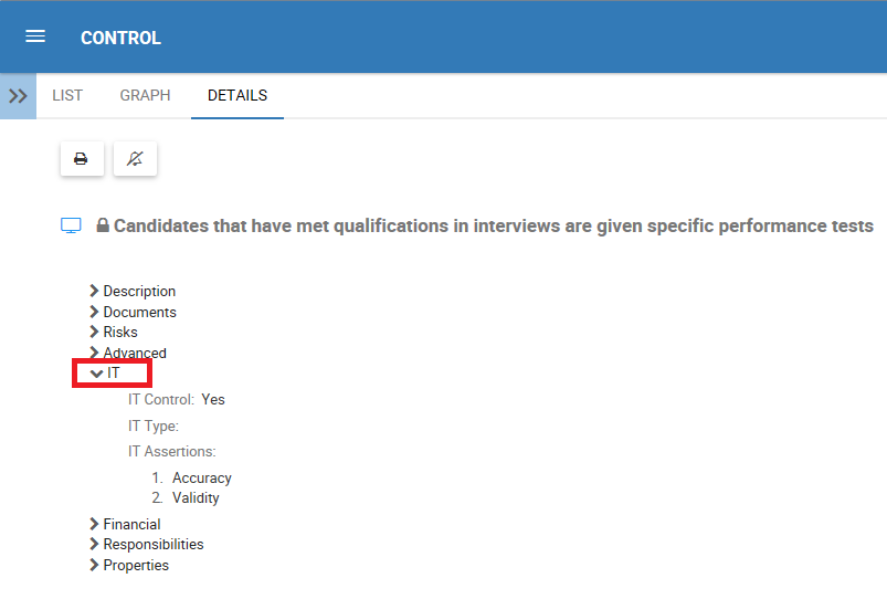 The IT section displays if there is an IT Control, which type of IT Control, and which types of IT Assertions.