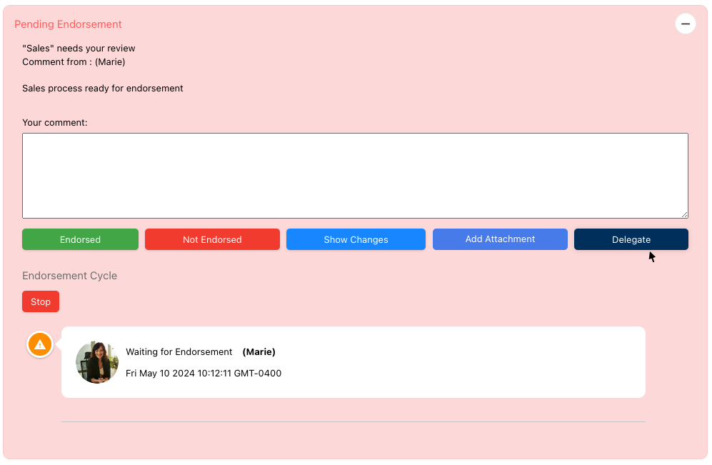- Click on the ‘Delegate’ button within the ‘Pending Endorsement’ action box.