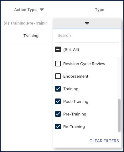 Click on the filter icon to further filter the list by training type: training, pre-training, post-training, or re-training.