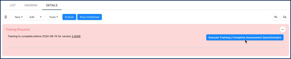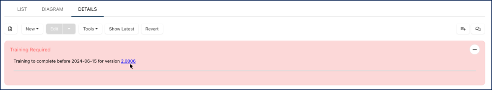 Training assignments will only appear in the version to which they are tied. For example, if you are in the latest version of a document but the training is in version 0.0001, you will need to switch to that version to access the training. Click on the blue version number to switch to the correct version.