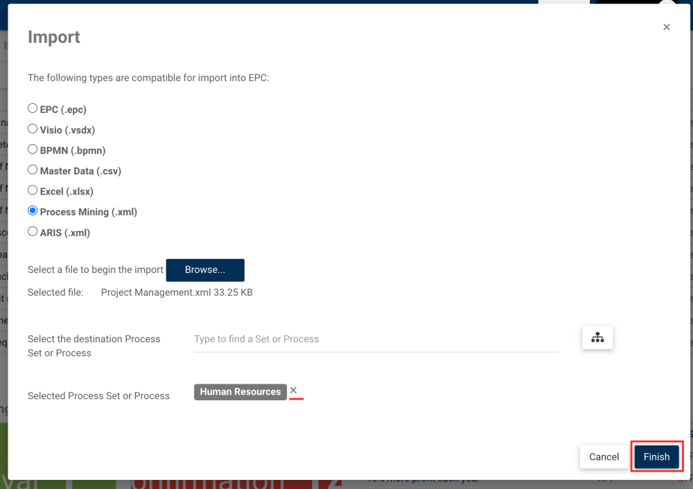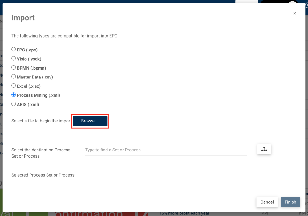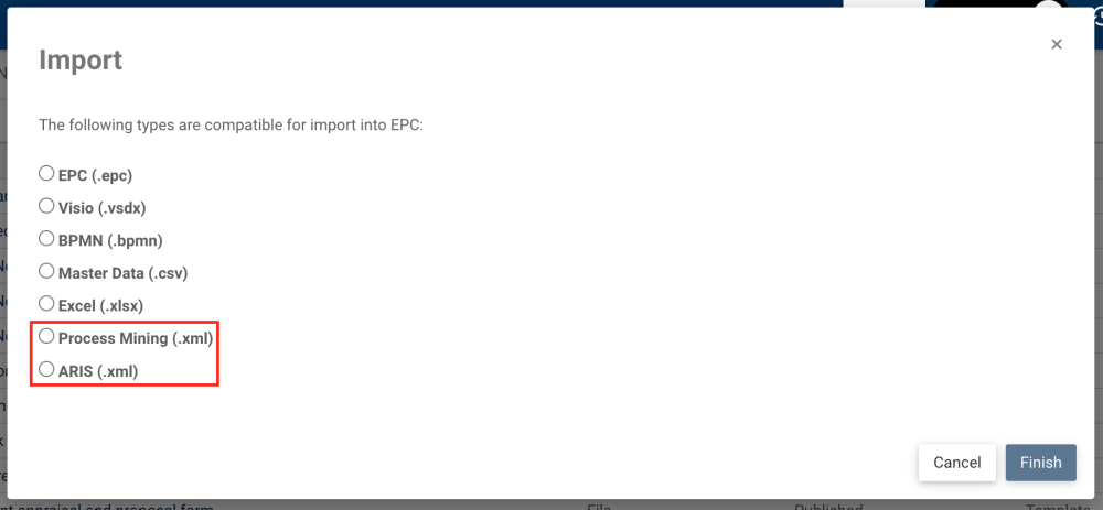 2. In the import window, select Process Mining (.xml) for Fluxicon files or ARIS (.xml).