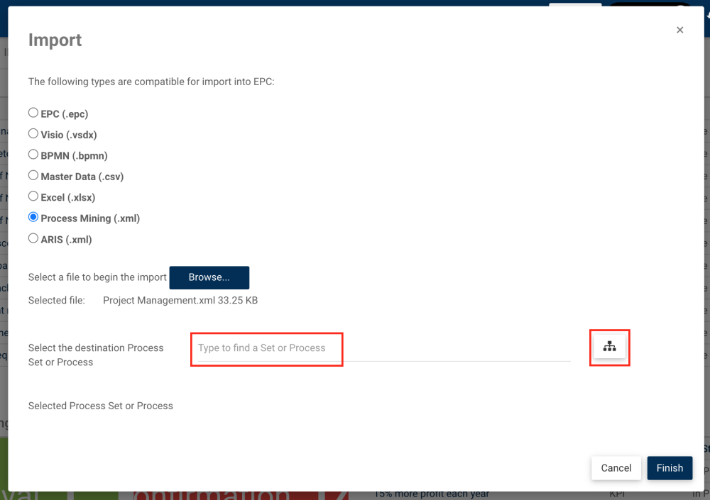 4. Choose the destination of the process within your existing EPC database by typing the name of the set or process or open the tree selector to see in real-time your EPC process hierarchy.